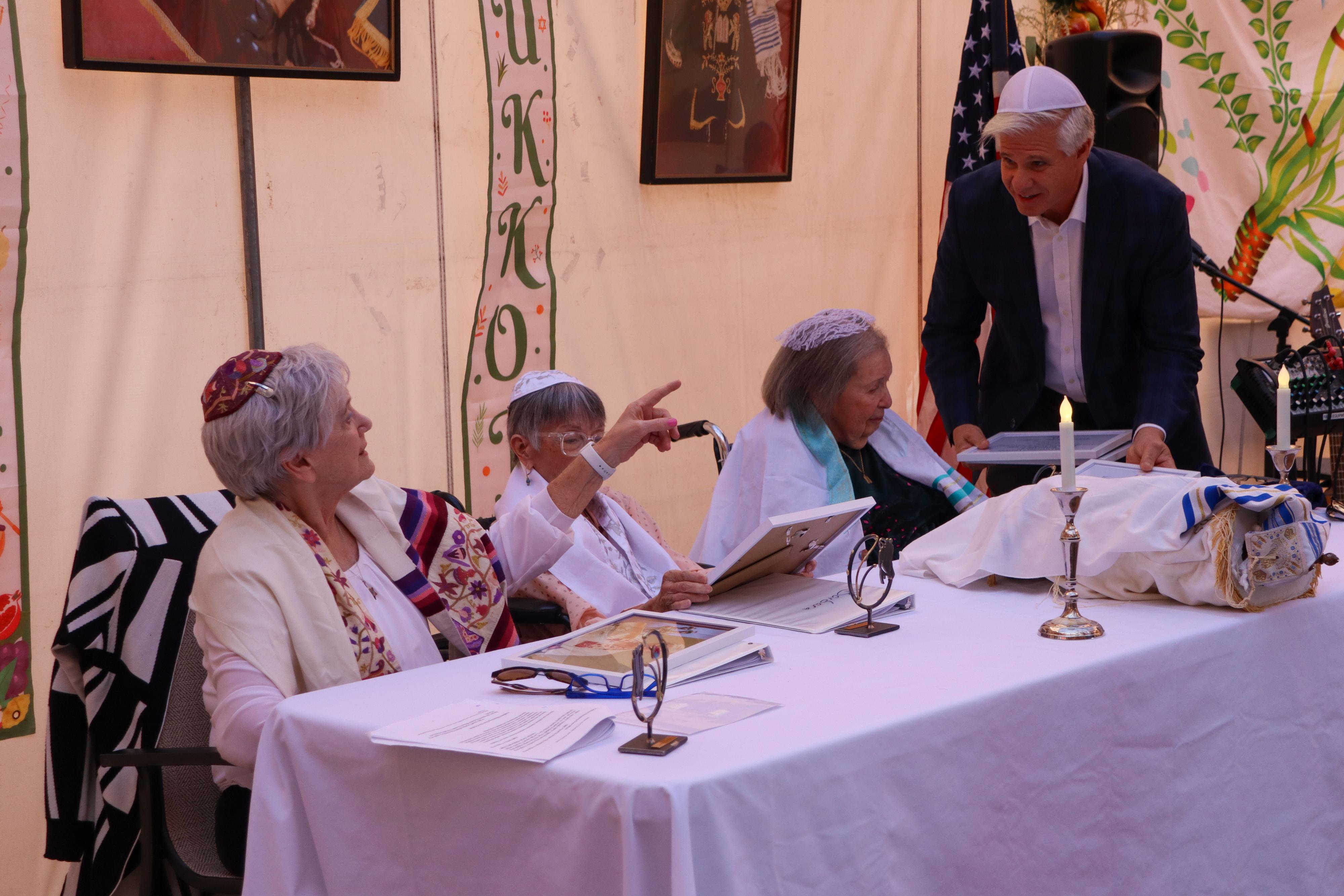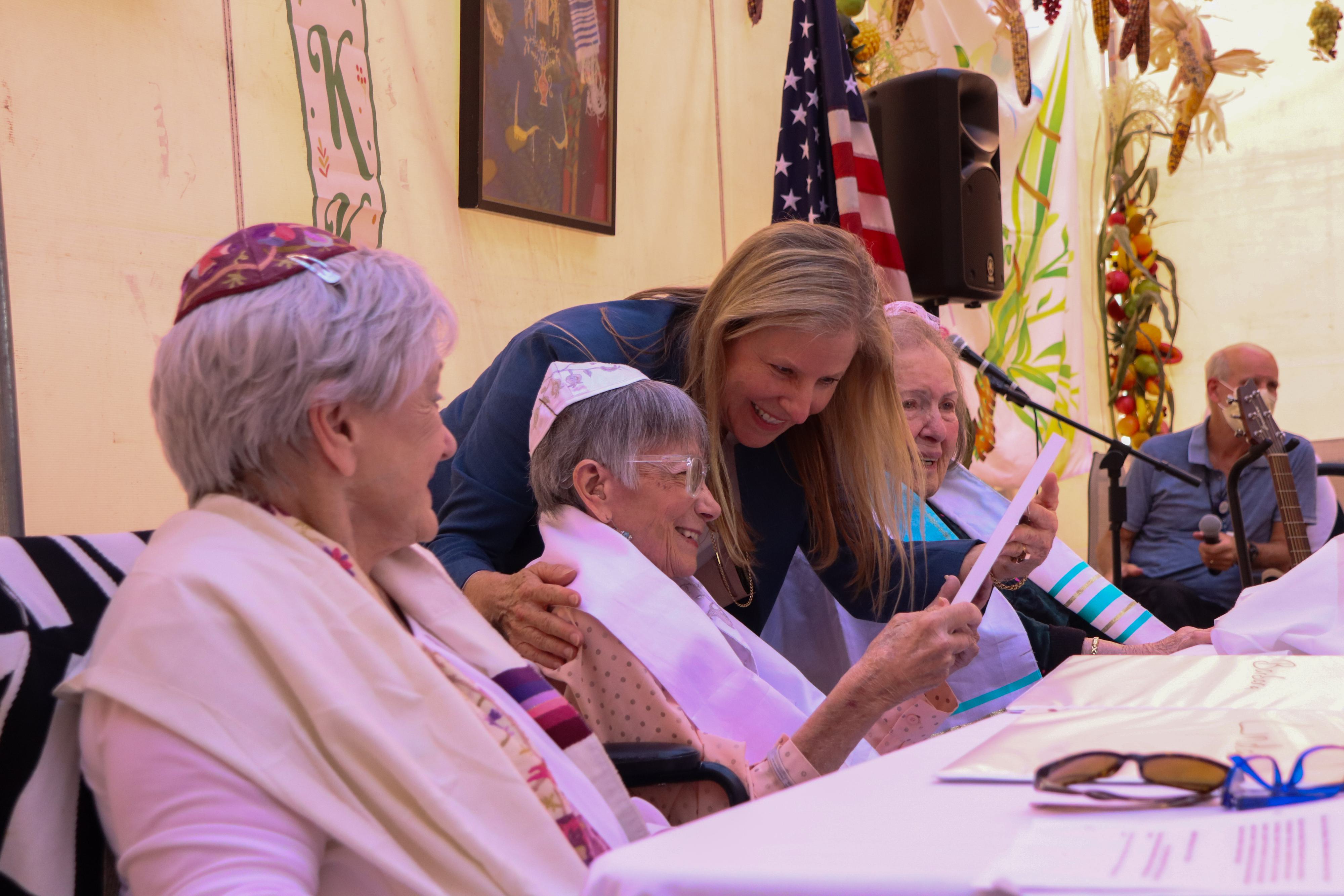 Confirmation is a way for Jewish students of post-bar or bat mitzvah age to continue engaging with their tradition and confirm their commitment to Jewish life. Inside a gorgeous sukkah erected in the main courtyard of LAJH’s Grancell Village campus, the assembled guests listened to the women—Etta Spiegel, 96; Barbara Fallick, 82; and Linda Zweig, 81—all of whom had previously had adult bat mitzvahs, chant from the Torah and offer astute insights into Jewish history, ritual, and culture. The ceremony was held as a highlight of LAJH’s Friday afternoon Shabbat service, led by Chief Mission Officer Rabbi Karen Bender.