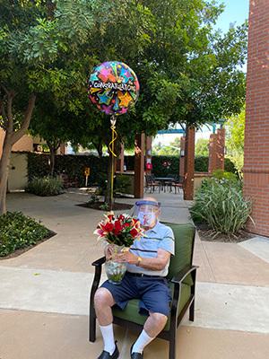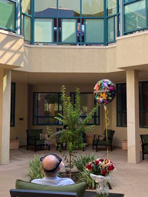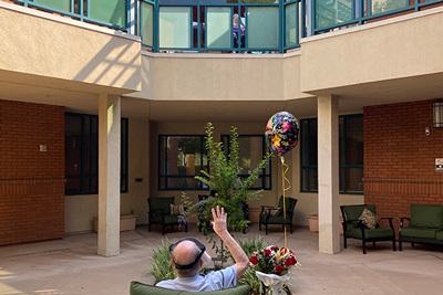 Then the planning began. "Our social worker went to the store to pick up balloons and flowers," Glass says. "When it was time for the meeting, our team brought the two of them to their designated spots, outfitted in PPE. Howard had a face shield, and Sheila had a mask, but the protective equipment didn't stop them from blowing kisses to each other."