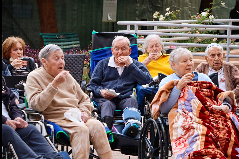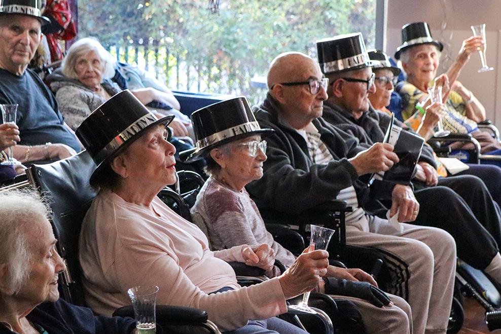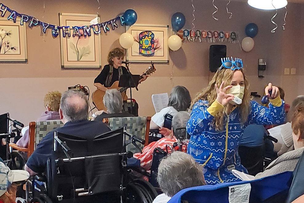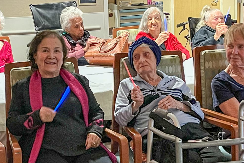 As holidays approach, it is always our goal to ensure residents experience something akin to what they would have had in their homes and at synagogue. This year, we are proud to have gone beyond that goal to bring joy, celebration, surprise and delight! Residents enjoyed not only potato latkes but also creative vegetable latkes. They enjoyed traditional sufganiyot and kosher Krispy Kreme donuts. At Grancell Village, they experienced a sufganiyah tasting, including creme brulee and dulce de leche. There were concerts performed at each campus with the renowned Cindy Paley and elaborate outdoor extravaganza lightings with our enormous and artistic outdoor Chanukiot. Twelve year old twin volunteers dressed up as a life sized menorah and dreidel and visited each floor bringing smiles and laughter. Shabbat Chanukah services were led by a skilled nursing resident Rabbi and a band he assembled! Resident volunteers took charge of lighting the menorah lights on their floors each night. At the Joyce Eisenberg-Keefer Medical Center, those same twin volunteers assisted me in re-affixing mezuzahs on every room, as residents participated. Rabbi Ron Goldberg held a food and toy drive at Eisenberg Village, enabling the entire campus to participate in seasonal giving to those in need. In the midst of it all, our wonderful activities staff ensured that residents celebrated New Year’s 2025, perhaps a once in a lifetime overlap with Chanukah. We are so grateful to all who worked together bringing so much joy and celebration to the residents of LAJH!