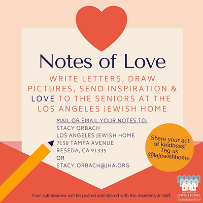 There is no need to put a specific date or name on the communication as we will share them broadly at our various sites over the coming weeks. To participate, simply send your creation to Stacy Orbach C/O Los Angeles Jewish Home, 7150 Tampa Avenue, Reseda, CA 91335 or send via email to [email protected]. And remember to share your act of kindness by tagging us @lajewishhome.