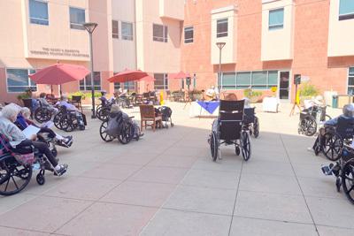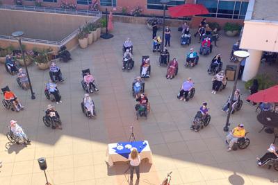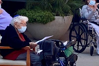 Friday, May 7th was a picture perfect Southern California afternoon. The courtyard at Grancell Village was sun drenched—yet, as it was midafternoon, there was plenty of shade for those who preferred it. A similar scene was unfolding at Eisenberg Village. Then it happened. After a year of public health regulations, so important to keep everyone safe, there was finally a green light to, carefully and cautiously, hold the first outdoor Shabbat services at the Jewish Home for 2021.